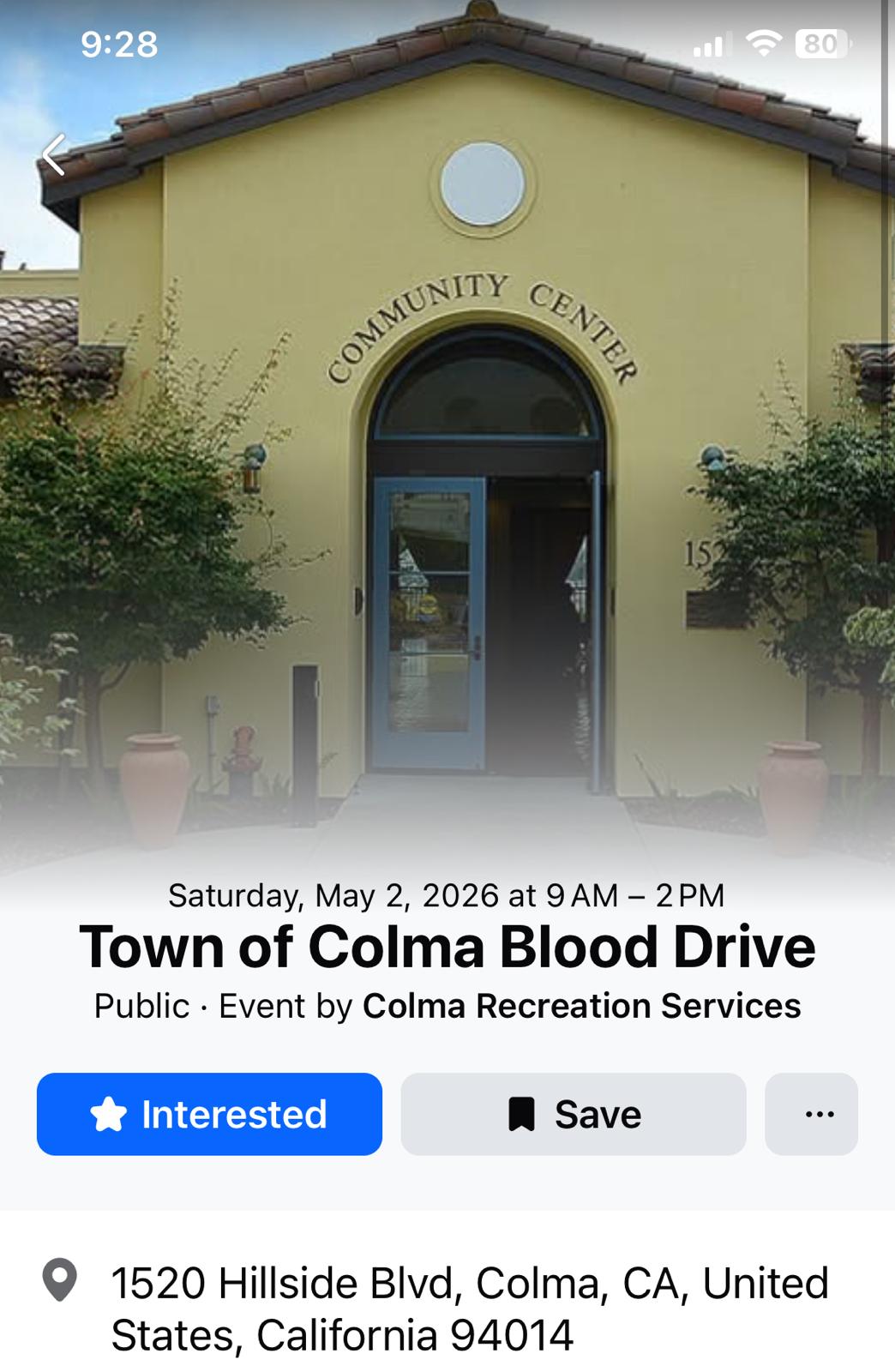 Town of Colma Blood Drive, 9am-2pm, Appointments recommended, Colma Community Center, 1520 Hillside Blvd, Colma 94014, Learn more