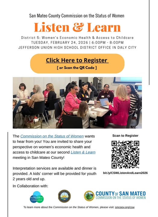 San Mateo County Commission on the Status of Women Listen & Learn Women's Economic Health and Access Child Care, 6-8pm, Jefferson Union High School District Office, 123 Edgemont Dr, Daly City, CA 94015, Learn more