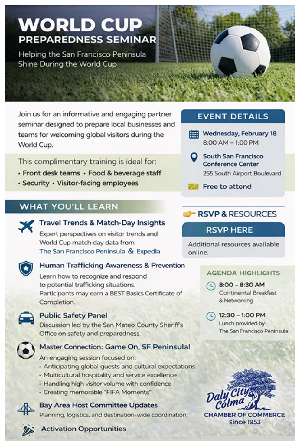 SF Peninsula Chamber World Cup Seminar, 8am-1pm, SSF Conference Center, 255 S Airport Blvd, SSF 94080 Learn more