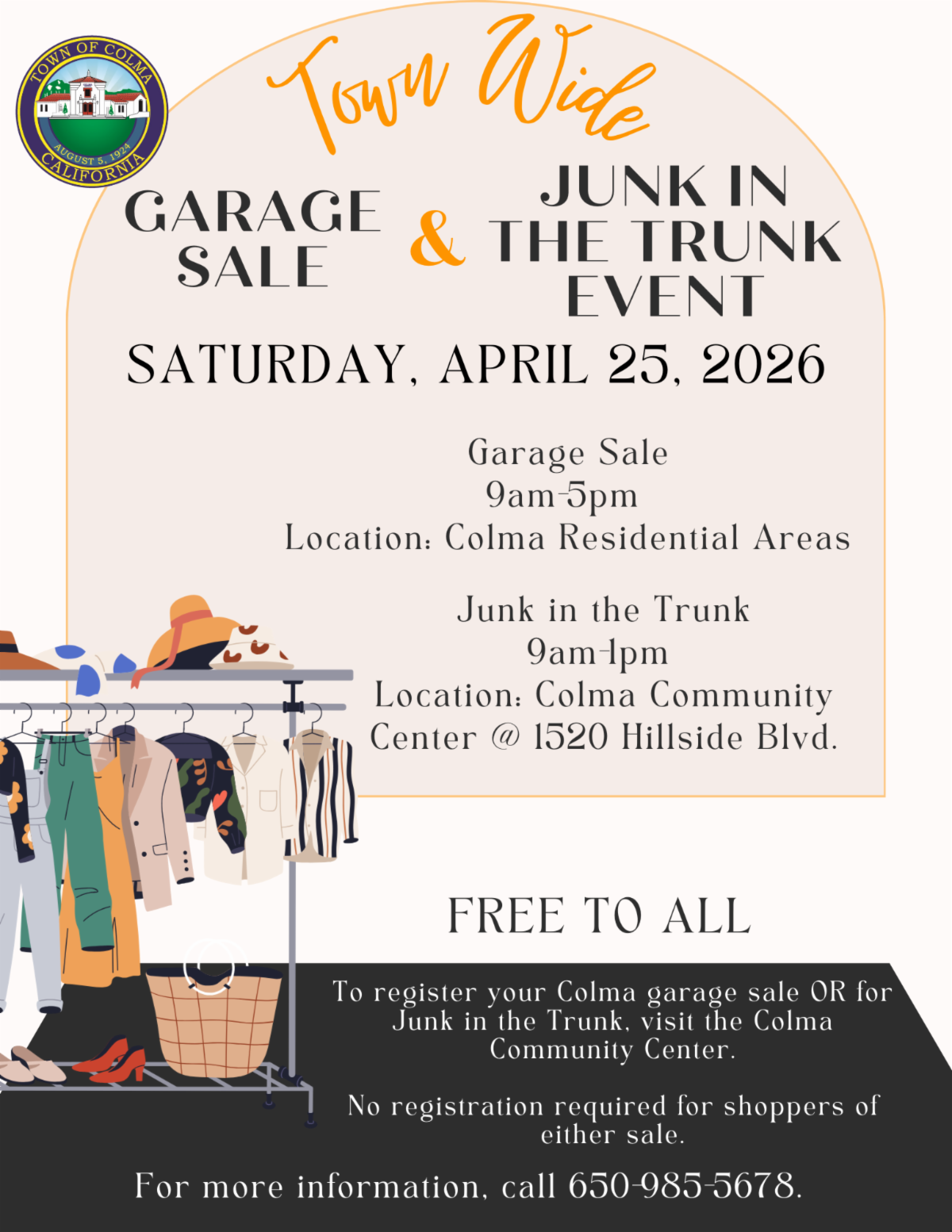 Town of Colma Town Wide Garage Sale & Junk in the Trunk Event, Garage Sale 9am-5pm, Junk in the Trunk 9am-1pm, Colma Community Center, 1520 Hillside Blvd, Colma, 94014, Learn more