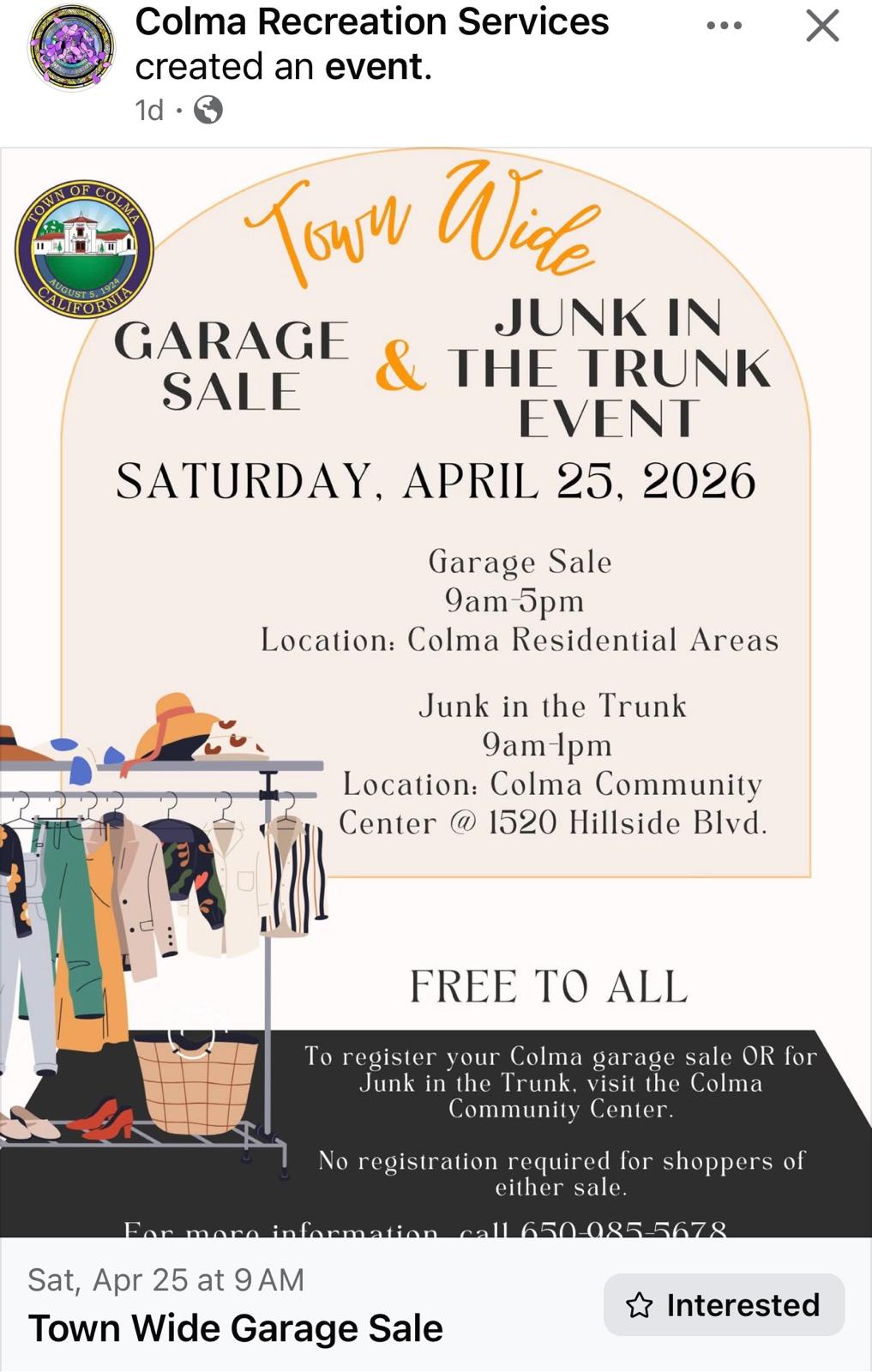 Town of Colma Town Wide Garage Sale & Junk in the Trunk Event, Garage Sale 9am-5pm, Junk in the Trunk 9am-1pm, Colma Community Center, 1520 Hillside Blvd, Colma, 94014, Learn more |