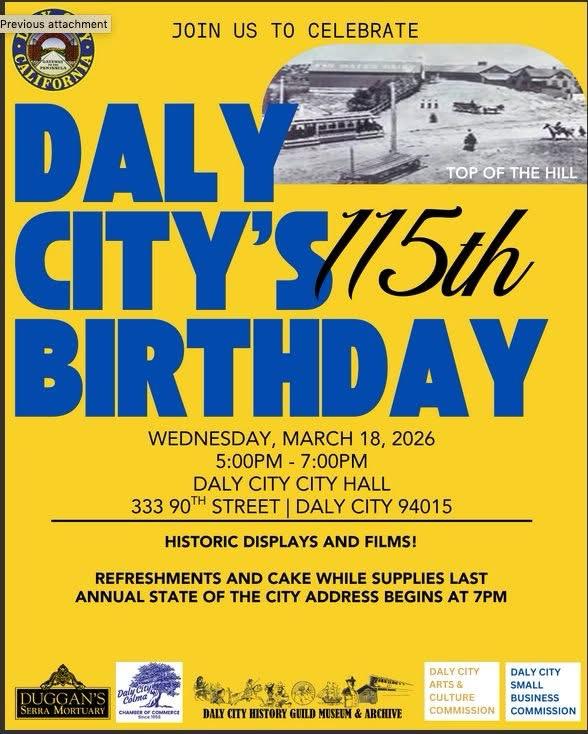 City of Daly City, Daly City Colma Chamber of Commerce, Daly City Museum, & Daly City Art Commission Celebrate City of Daly City 115th Birthday, 5-7pm, 333-90th Street, Daly City, 94015 Learn more