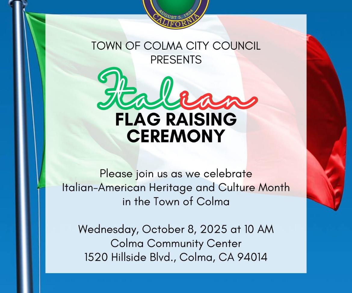 Town of Colma Italian Flag Raising Ceremony, 10am, 1520 Hillside Blvd, Colma, CA 94014-2869.Learn more